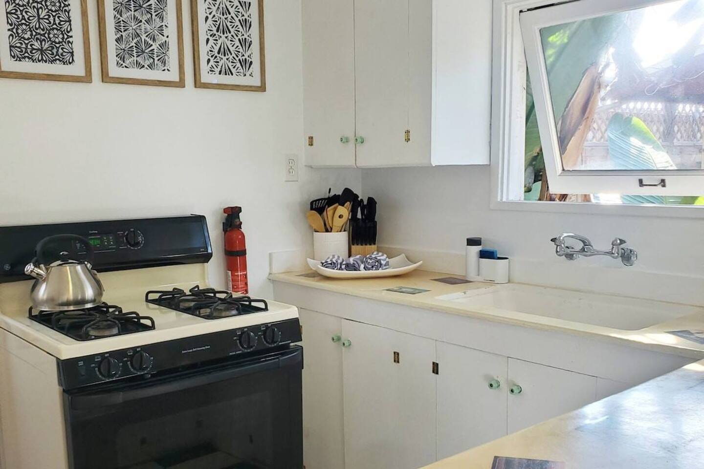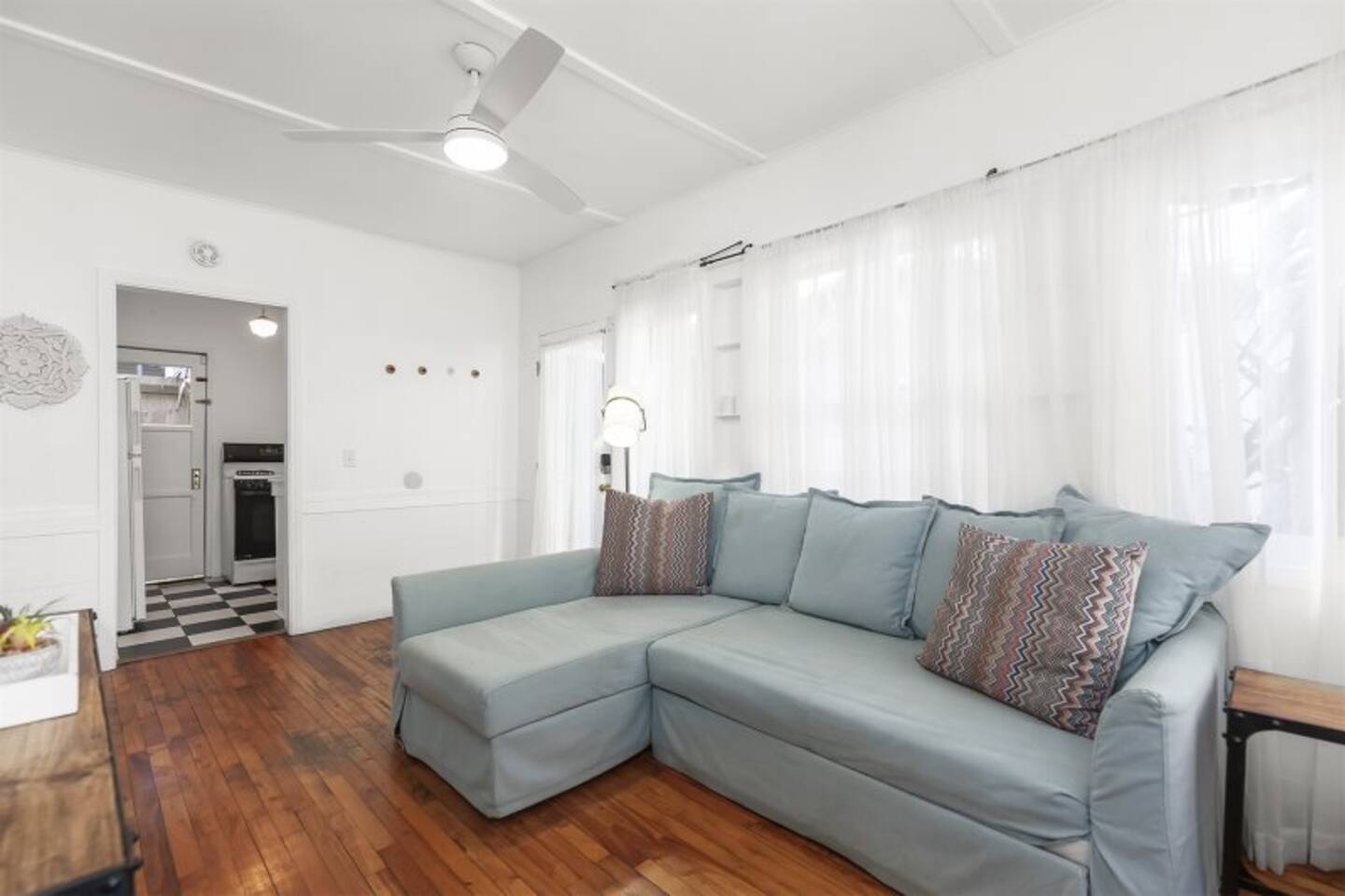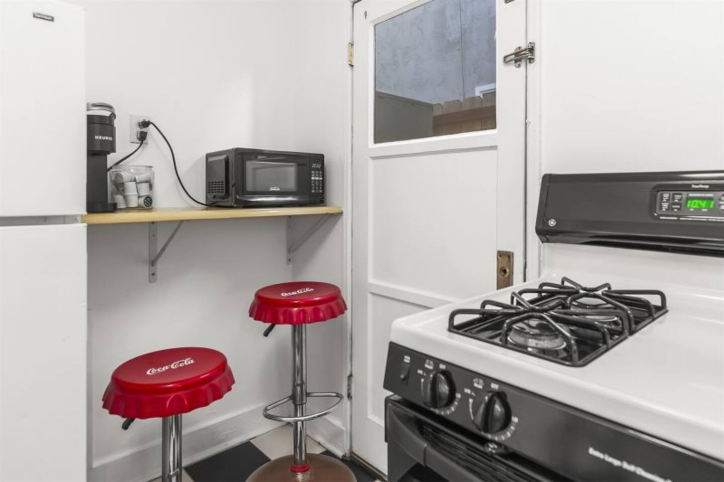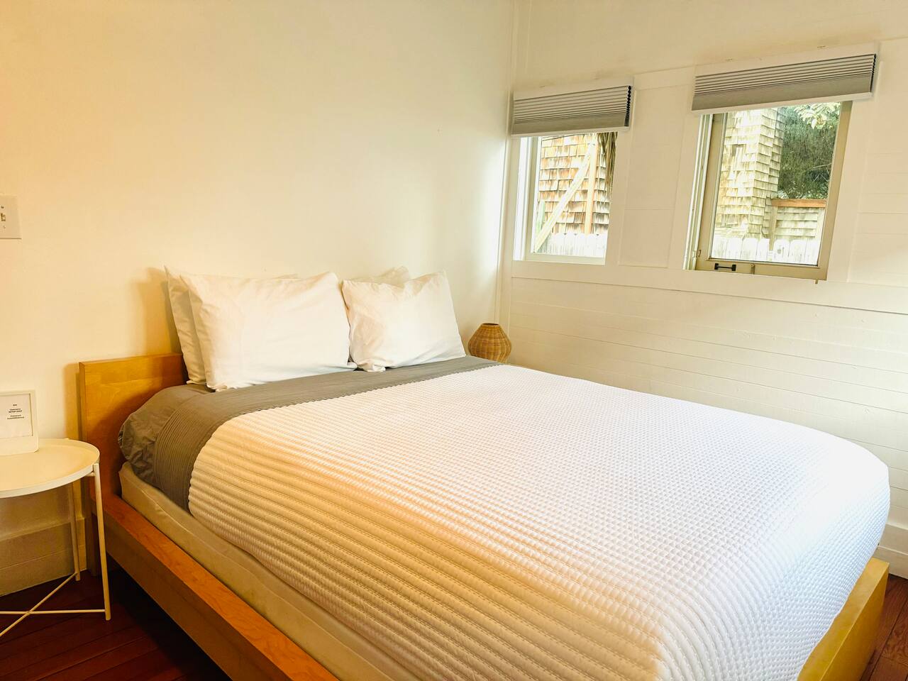 Queen bed plus a cozy IKEA pull-out sofa for extra comfort. • Pack ‘n Play and high chair available upon request. • All the travel essentials provided, including shampoo, conditioner, and body wash. • Kitchen stocked with coffee, tea, basic spices, oil, and more for your cooking needs. • Sparkling clean bathroom with a tiled shower and modern vanity. • Stylish, super clean space with chic furniture. • Keurig coffee machine with plenty of pods to fuel your mornings. • Large windows to let in the refreshing sea breeze and plenty of natural light.