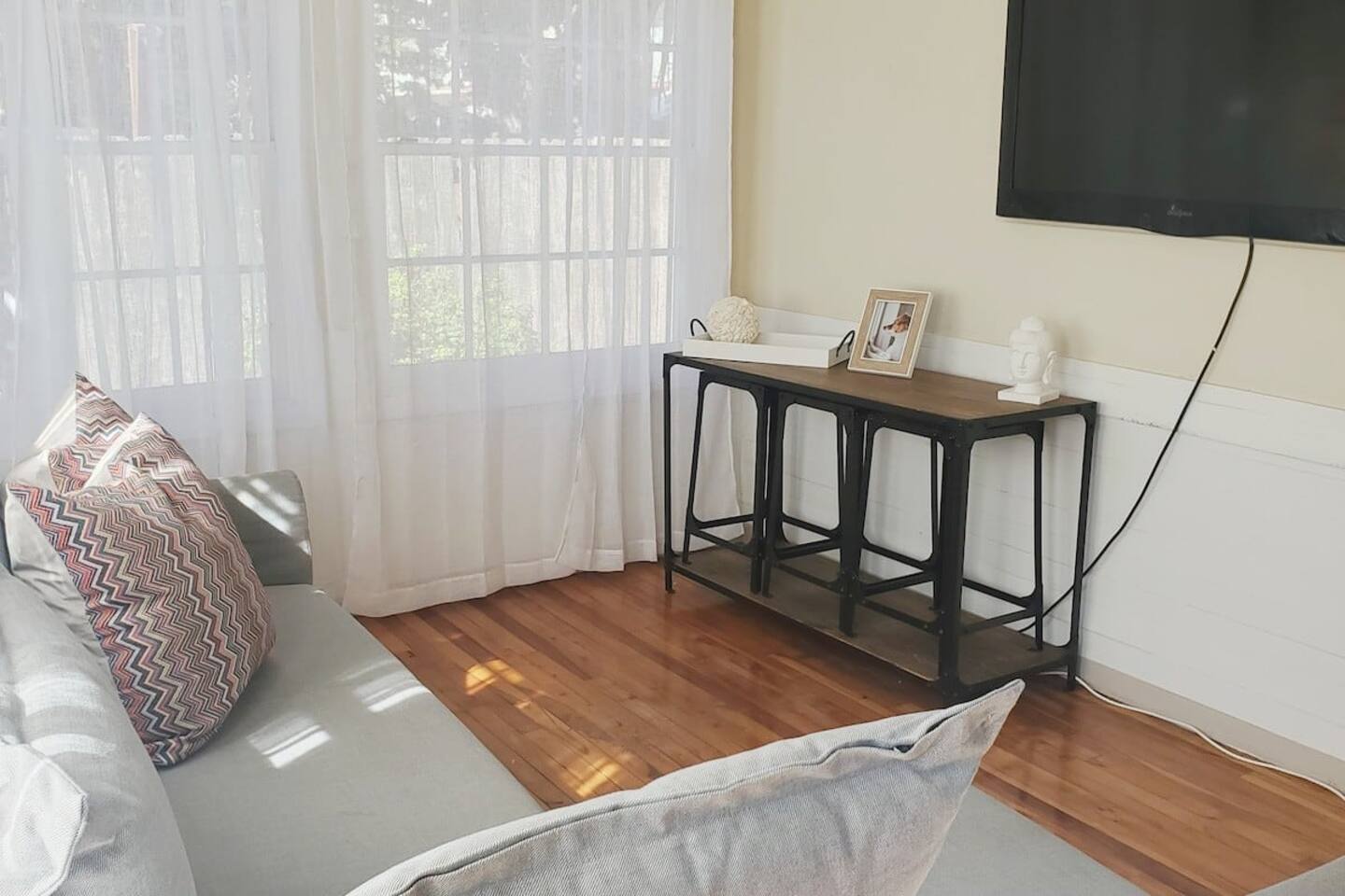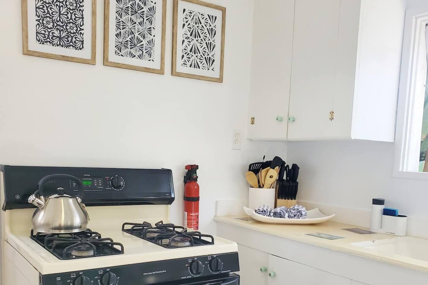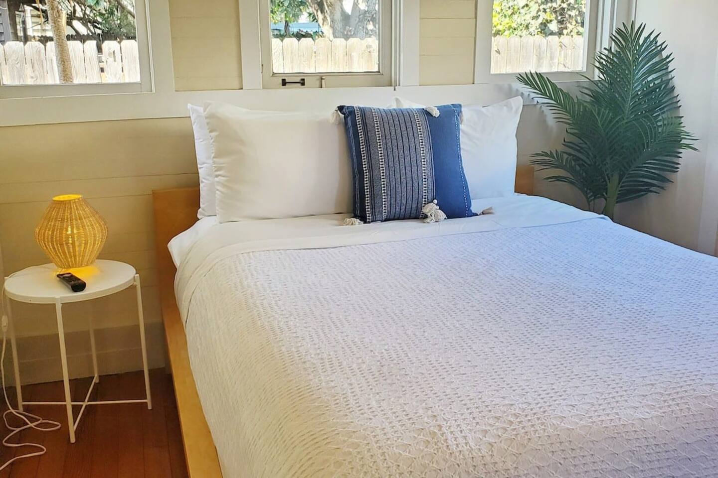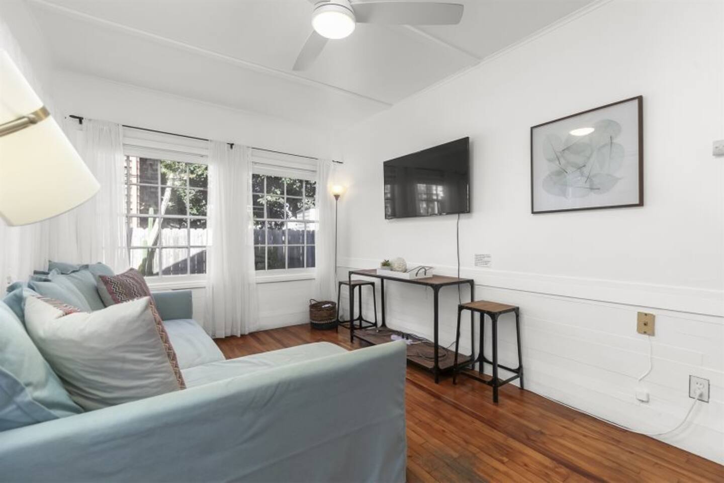 Queen bed plus a cozy IKEA pull-out sofa for extra comfort. • Pack ‘n Play and high chair available upon request. • All the travel essentials provided, including shampoo, conditioner, and body wash. • Kitchen stocked with coffee, tea, basic spices, oil, and more for your cooking needs. • Sparkling clean bathroom with a tiled shower and modern vanity. • Stylish, super clean space with chic furniture. • Keurig coffee machine with plenty of pods to fuel your mornings. • Large windows to let in the refreshing sea breeze and plenty of natural light.